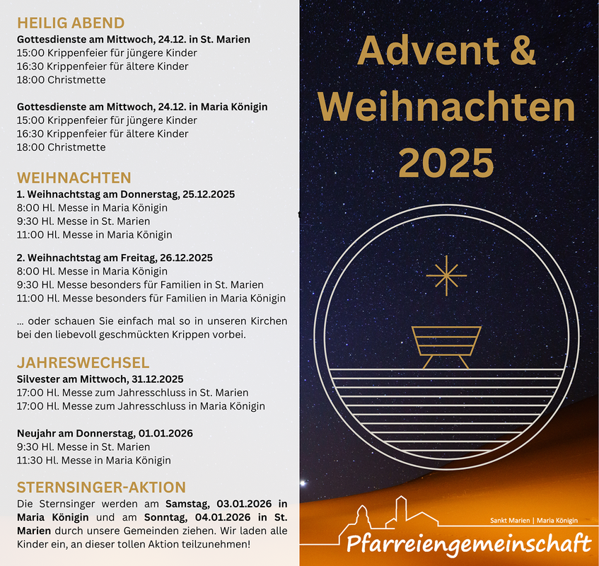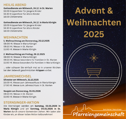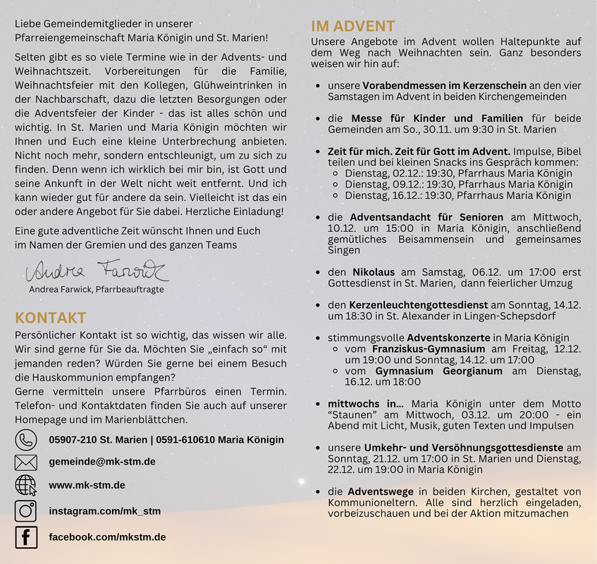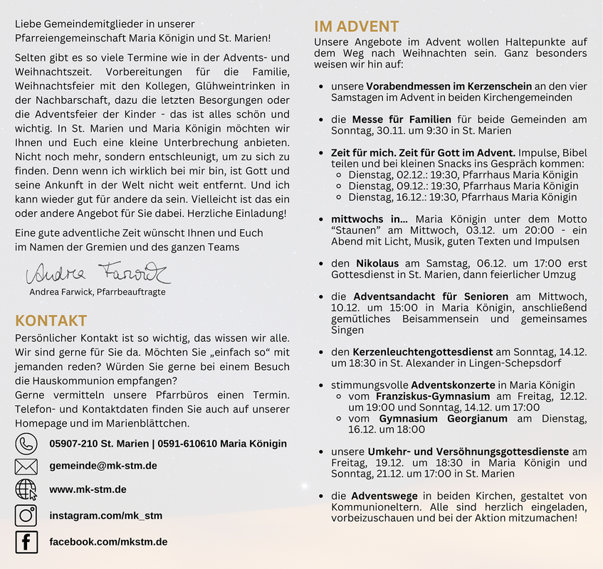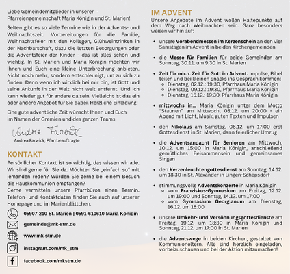 Selten gibt es so viele Termine wie in der Advents- undWeihnachtszeit. Vorbereitungen für die Familie, Weihnachtsfeier mit den Kollegen, Glühweintrinken in der Nachbarschaft, dazu die letzten Besorgungen oder die Adventsfeier der Kinder - das ist alles schön und wichtig. In St. Marien und Maria Königin möchten wir Ihnen und Euch eine kleine Unterbrechung anbieten. Nicht noch mehr, sondern entschleunigt, um zu sich zu finden. Denn wenn ich wirklich bei mir bin, ist Gott und seine Ankunft in der Welt nicht weit entfernt. Und ich kann wieder gut für andere da sein. Stöbern Sie also gerne in unserem Flyer zur Advents und Weihnachtszeit - vielleicht ist das ein oder andere Angebot für Sie dabei.