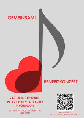 Unter dem Motto "GEMEINSAM!" findet am Freitag, den 23.1.2026 um 19 Uhr in der Kirche St. Alexander in Schepsdorf ein Benefizkonzert für die Familie Mansour aus Damaschke statt.