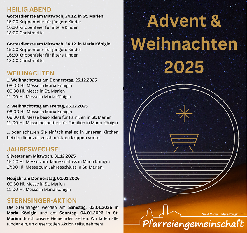 - Werktage: Mittwoch 8:30 Uhr (Maria Königin), Donnerstag 9:15 Uhr (St. Marien). Abendmessen entfallen.
