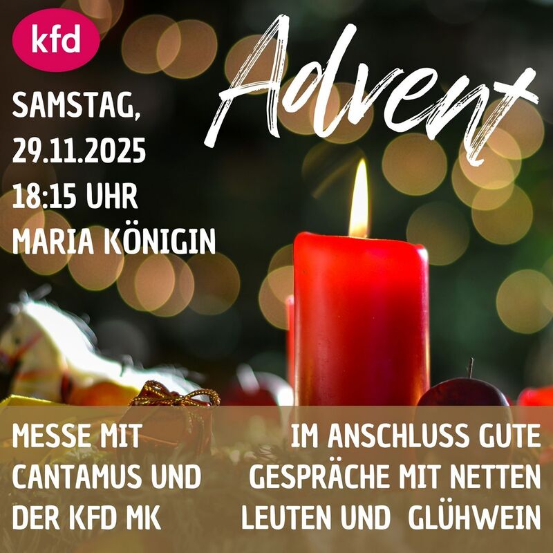 Am 29.11.2025 starten wir in Maria Königin zusammen mit der kfd und unserem Chor Cantamus in einer besonders gestalteten Vorabendmesse besinnlich in den Advent.