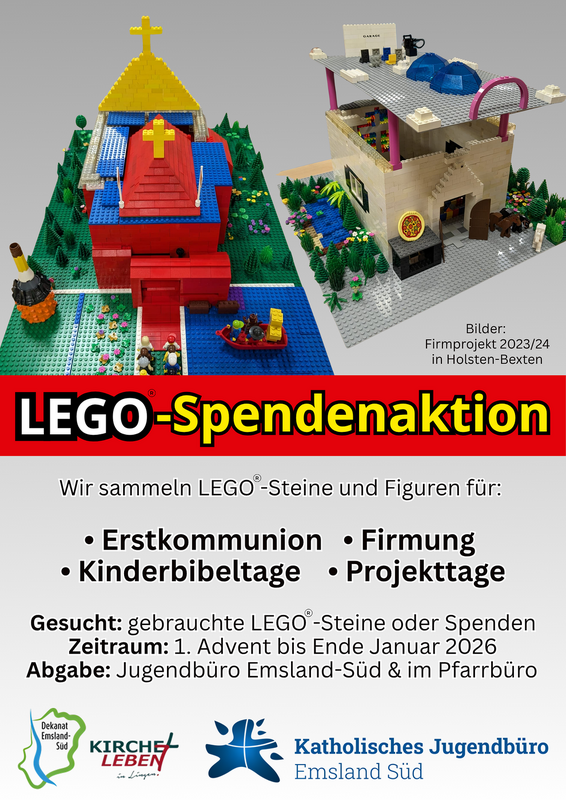 Für unsere kreativen Projekte rund um Erstkommunion, Firmung, Kinderbibeltage und Projektwochen möchten wir für unser Dekanat eine große Sammlung an LEGO-Steinen aufbauen. Damit können Kinder und Jugendliche Glauben spielerisch entdecken und gestalten.