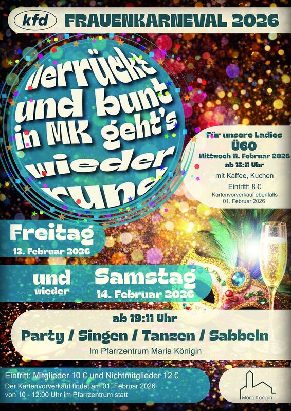 Unter dem Motto "Verrückt und bunt - in MK geht’s wieder rund" lädt die kfd Maria Königin herzlich zum Frauenkarneval ins Pfarrzentrum Maria Königin ein.