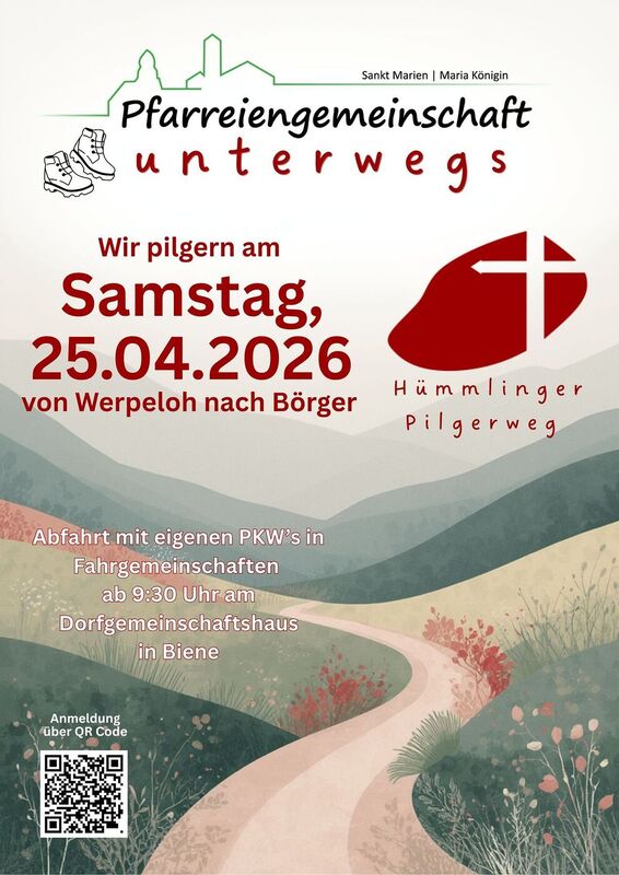 Am Samstag, 25.04.2026 laden, die Pfarrgemeinderäte aus MK und StM, die Gemeinde zum Pilgern ein. Wir wandern über einen Teil des "Hümmlinger Pilgerweg", von Werpeloh nach Börger. (Ca. 10 km)