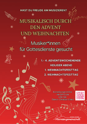 Wie in den vergangenen Jahren, suchen wir für die Advents- und Weihnachtsgottesdienste, Musiker*innen, die Freude haben, unsere Gottesdienst musikalisch mitzugestalten. Wir suchen keine Profis, sondern Menschen die Freude am musizieren haben.