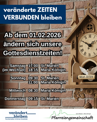 Mit den Pfarrgemeinderäten haben wir intensiv beraten und einen neuen Plan für die Gottesdienstzeiten erarbeitet, der zum 31.01.2026 in Kraft tritt. Wichtig war uns dabei, dass in St. Marien und in Maria Königin weiterhin am Sonntag - als Tag des Herrn und Feier der Auferstehung- eine Messe gefeiert wird.